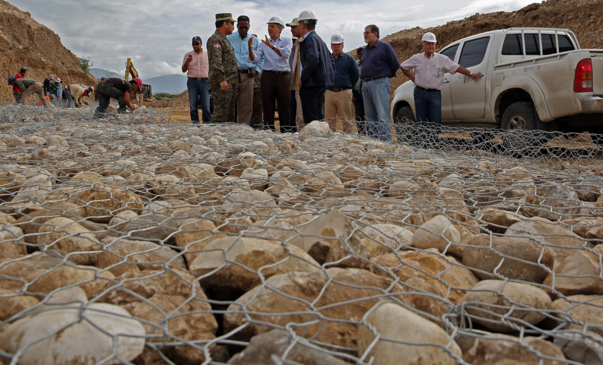El ministro, José Ramón Peralta al conversar sobre la obra con el mayor general, Rafael Emilio de Luna Pichirilo director general de Promoción de Comunidades Fronterizas del Ministerio de Defensa, presente durante el recorrido de seguimiento del funcionario y comitiva.