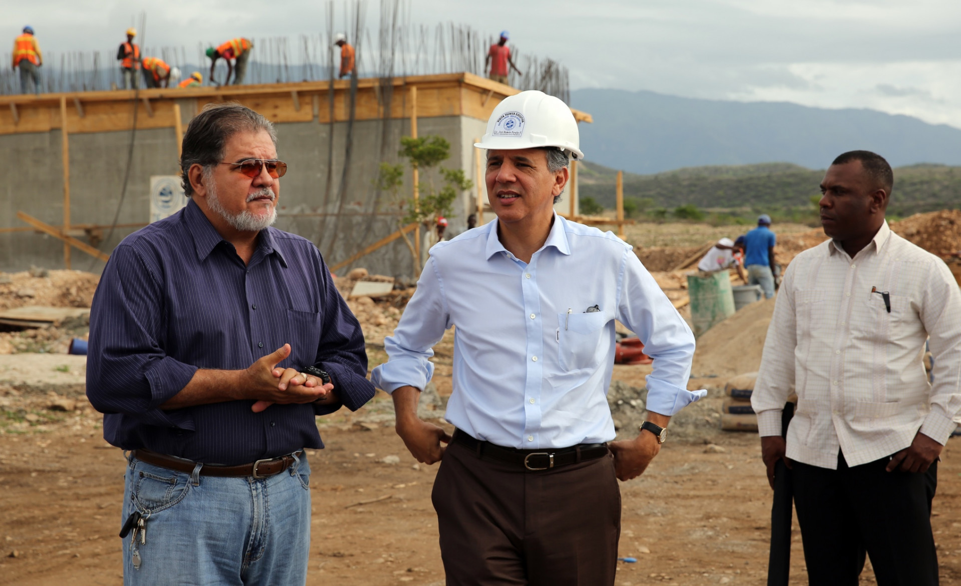 El ministro Administrativo de la Presidencia y personal que trabaja en el proyecto habitacional, durante visita de supervisión a la obra.