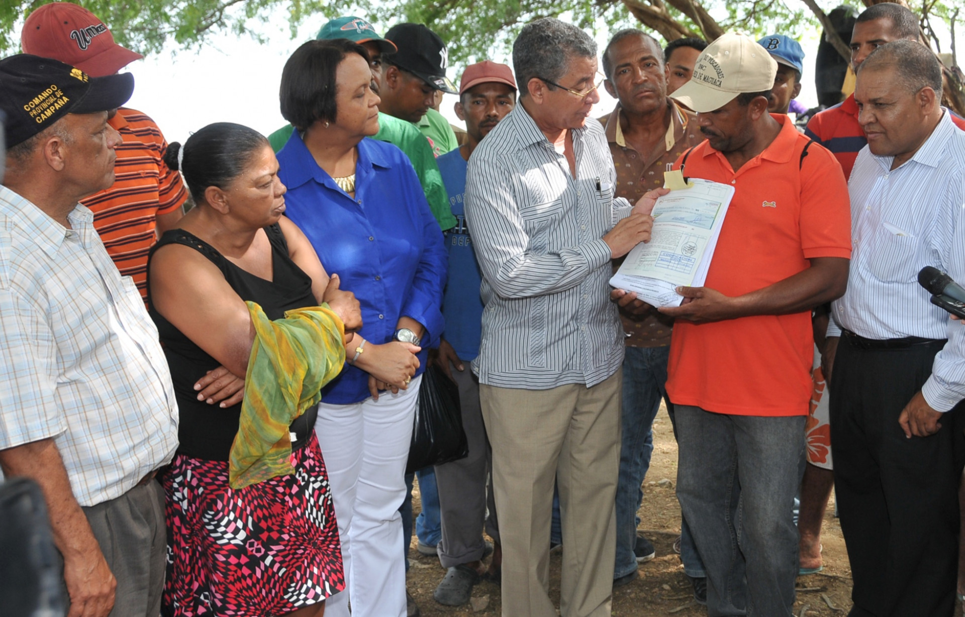 Antonio López, director de FEDA y pescadores de la Presa de Maguaca, organizado en asociaciones del municipio, en Las Matas de Santa Cruz, provincia Monte Cristi, que también fueron beneficiados con préstamos colectivos del Estado por la suma de 9 millones de pesos, a través de FEDA para la compra de jaulas, alevines, alimentos, equipos y transporte de su producción. Foto: Presidencia República Dominicana.