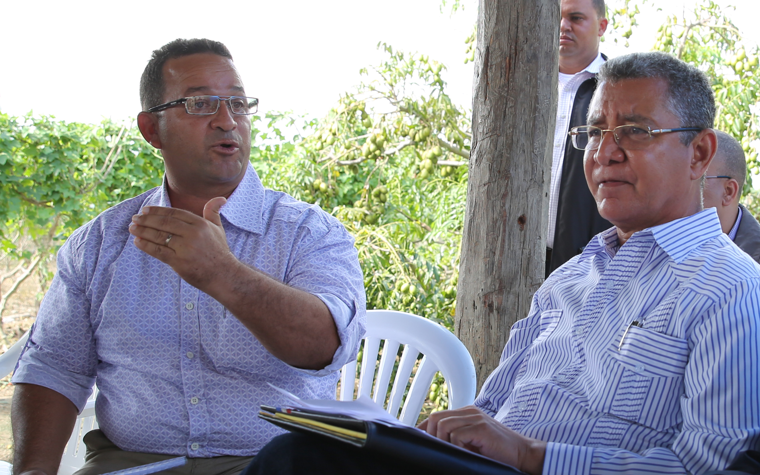 Dirigente de la asociacion de productores, Hansel Estévez, mientra expone al presidente Medina la necesidad de adquirir una planta empacadora para vender sus productos directamente, sin intermediación. Figura ademas el director de FEDA.