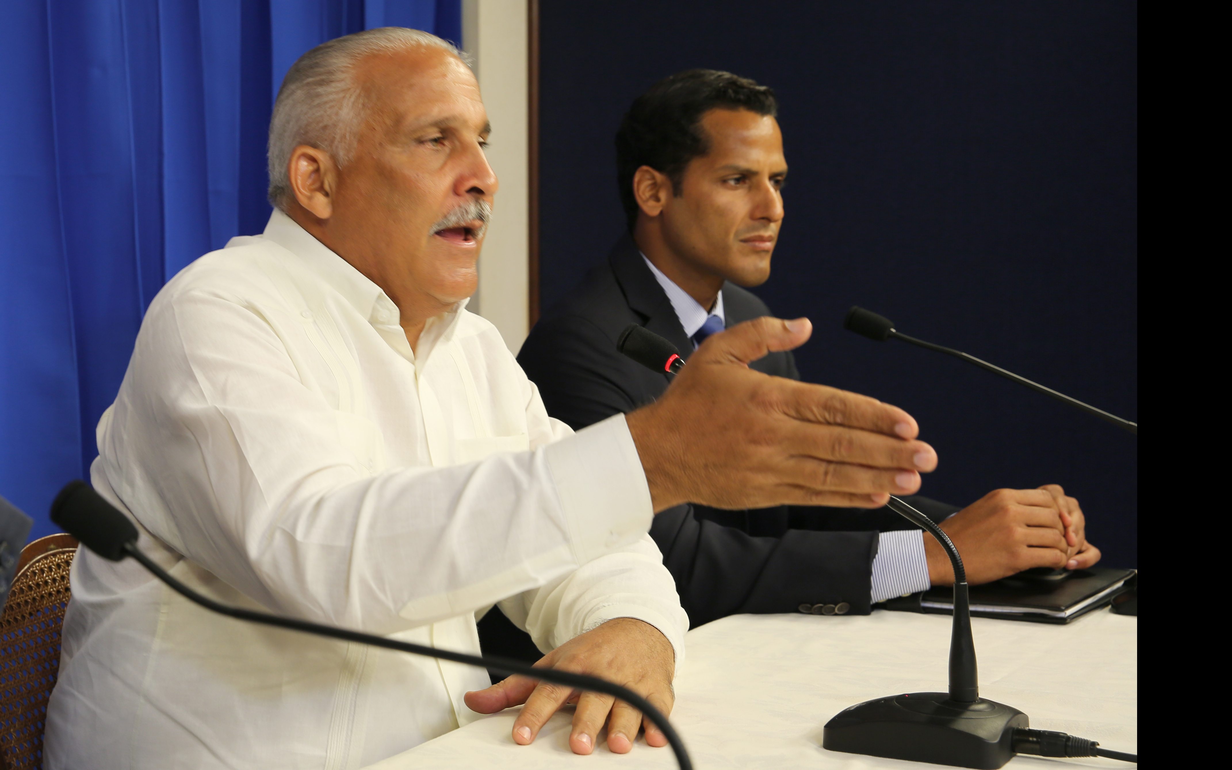 Ministro de Deportes, Jaime David Fernández Mirabal y el viceministro Marcos Díaz, al ofrecer detalles sobre los Juegos Nacionales Escolares, donde participaron 1,500 jóvenes y 400 de ellos alcanzaron la competencia final.
