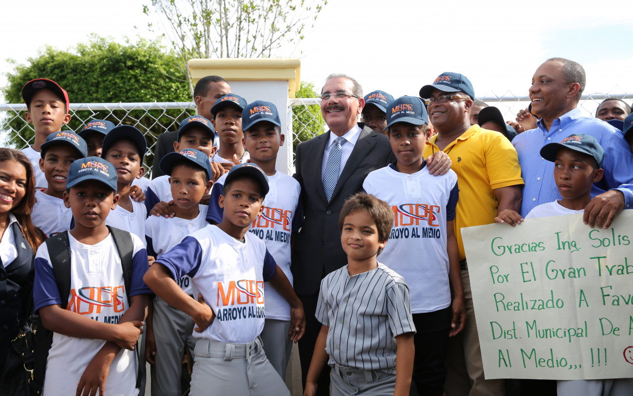 Participación del presidente de la República, Danilo Medina, junto a niños y jóvenes de la comunidad de Arroyo al Medio, presentes durante el acto inaugural de un moderno play para la recreación y al sano esparcimiento de sus habitantes.