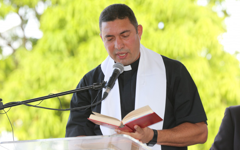 El párroco Manuel Segura bendice el Hospital Matancitas, durante acto inaugural en la provincia María Trinidad Sánchez.