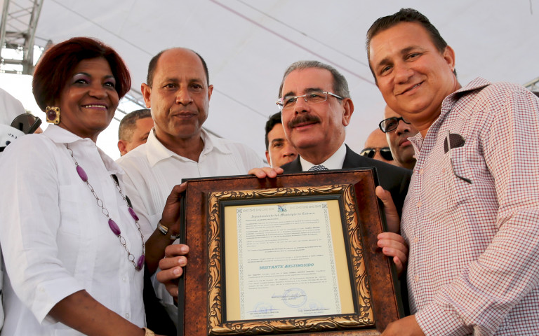 Vista del momento en que el presidente Danilo Medina recibe reconocimiento de representantes de la Sala Capitular de Cabrera, mediante resolución 015-2013, que declara al Mandatario como Visitante Distinguido.