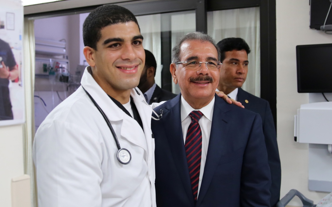 El presidente Danilo Medina y joven doctor de CEDIMAT, presente durante visita del Mandatario al portavoz del Gobierno, Roberto Rodríguez Marchena.