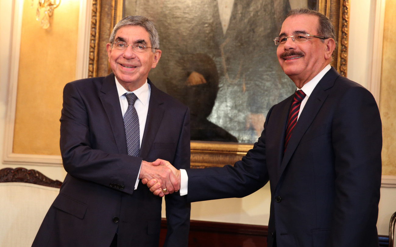 El presidente Danilo Medina y Oscar Arias Sánchez, ex presidente de Costa Rica, durante su encuentro en el Palacio Presidencial.