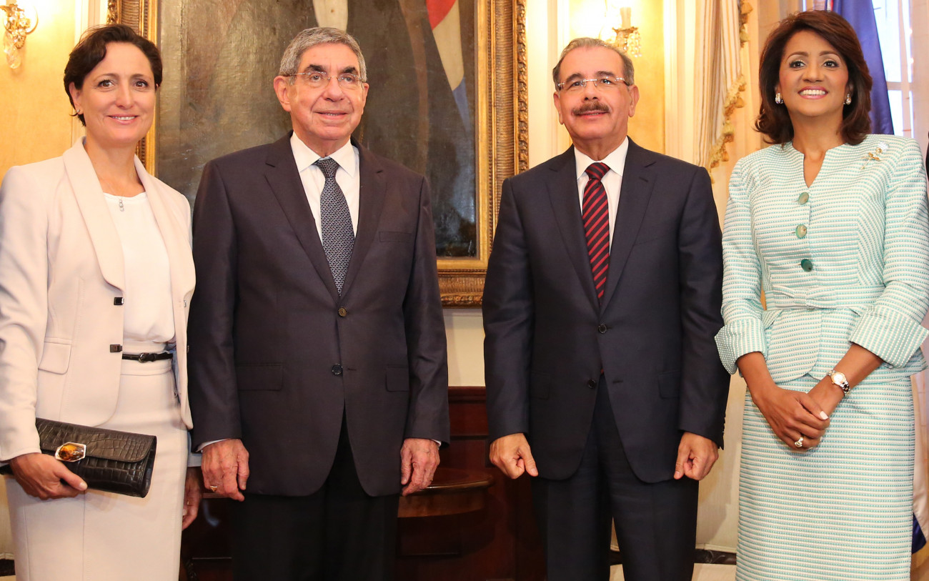 El presidente Danilo Medina, acompañado de su señora Cándida Montilla de Medina; el ex presidente de Costa Rica, Oscar Arias Sánchez y su esposa Suzanne Fischel de Arias, presentes durante su visita de cortesía, en su despacho del Palacio Nacional.
