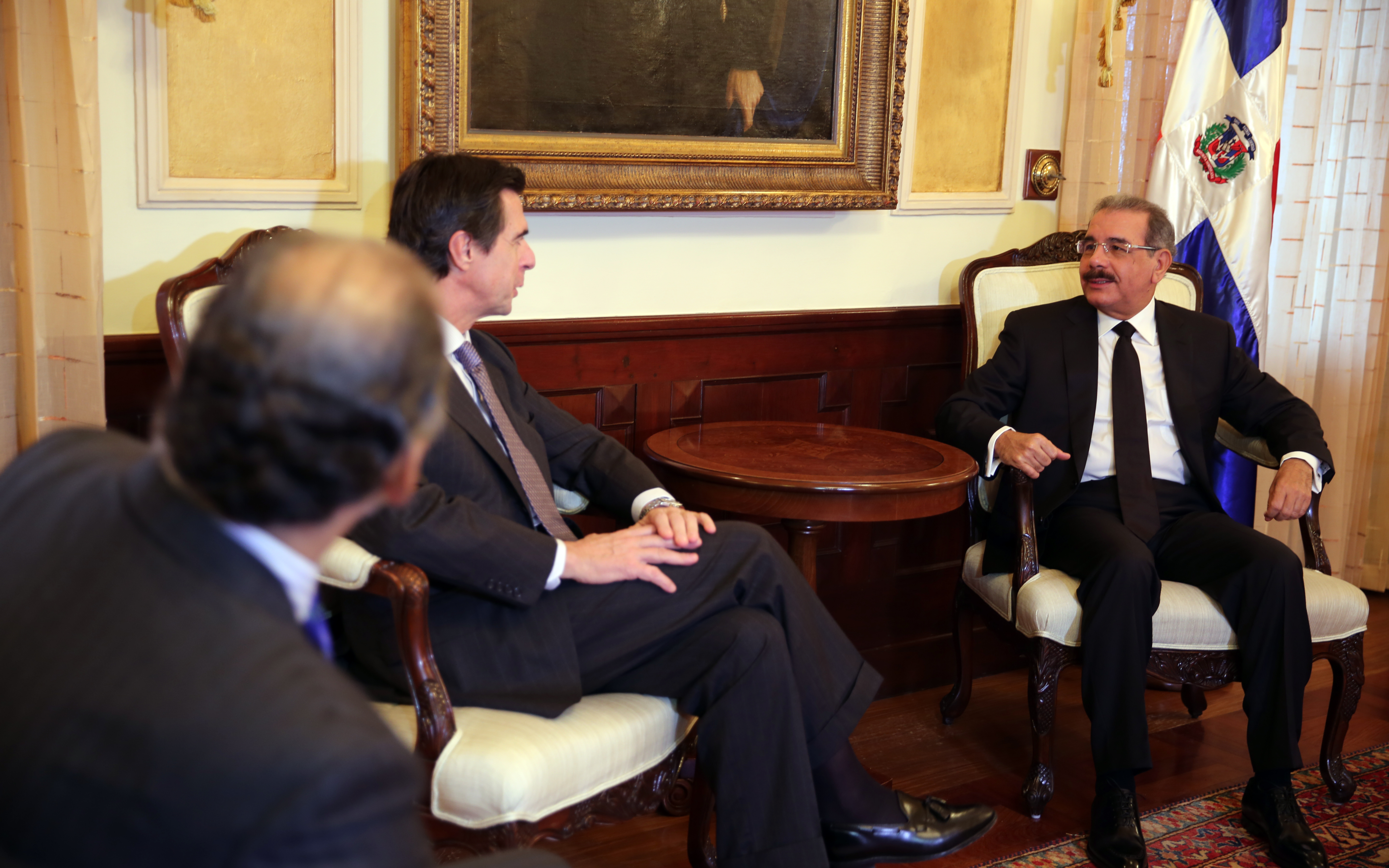 Desde derecha a izquierda, el Mandatario dominicano y José Manuel Soria, ministro de Industria, Energía y Turismo de España, durante encuentro efectuado hoy en su despacho del Palacio Nacional. Acompañan al funcionario, Jaime Lacadena, embajador de España en el país y Sofía Ruíz del Árbol, ministra consejera de la Embajada de España.