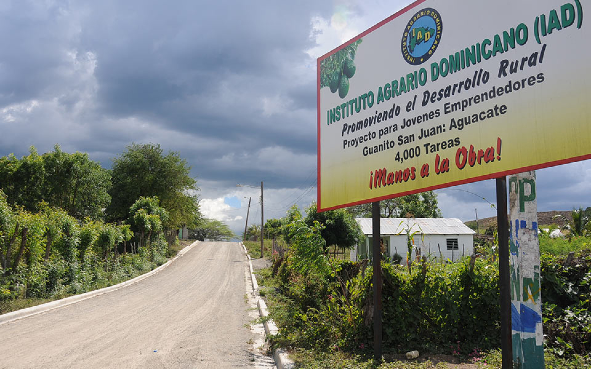 Vista de la entrada al Asentamiento Agrario Guanito I, en San Juan de la Maguana, para el cual el Instituto Agrario Dominicano (IAD) aportó 3,000 tareas y el Ministerio de la Juventud RD$3 millones de pesos para la compra de las 50,400 plántulas de aguacate; de la variedad Carla, que se cosecha fuera de fecha, como parte de la política de apoyo al desarrollo rural dispuesto por el presidente Medina.