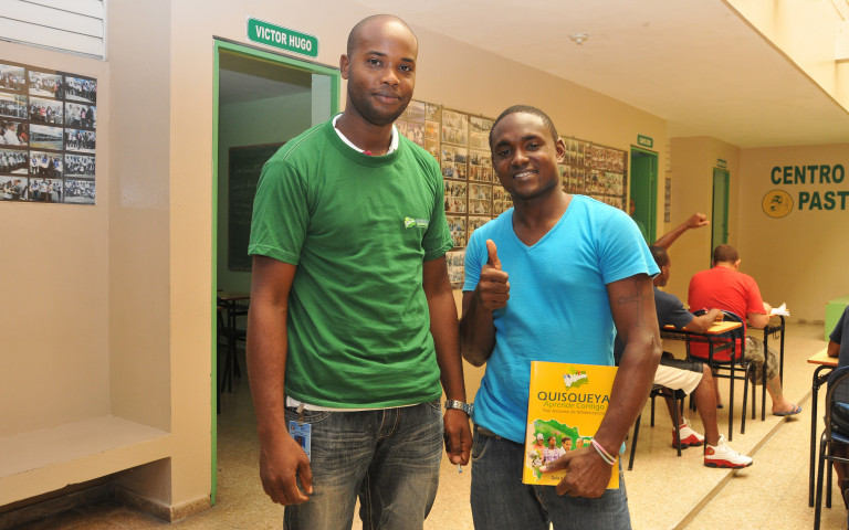 De izquierda a derecha, profesor que imparte clases del Plan Nacional de Alfabetización Quisqueya Aprende Contigo y estudiante del recinto penitenciario Najayo-Hombres, San Cristóbal.