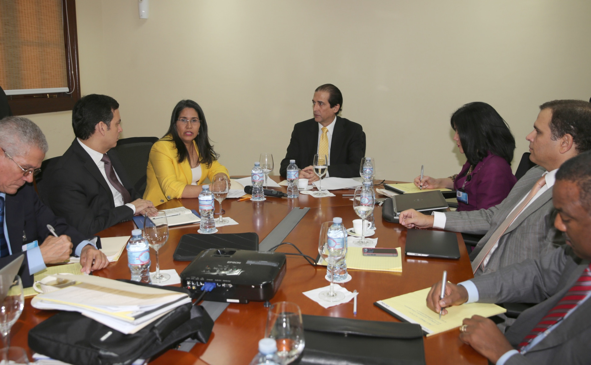 El ministro de la Presidencia, Gustavo Montalvo (al centro) junto a la ministra de Trabajo, señora Maritza Hernández; el director de Trabajo, Andrés Valentín Herrera; el vice-ministro Luis Henry Molina; los consejeros presidenciales Luis Vargas y Juan Ariel Jiménez, presentes en el segundo encuentro de la Comisión para la Reforma Laboral, efectuado hoy en el Salón Hermanas Mirabal, del Palacio Nacional.