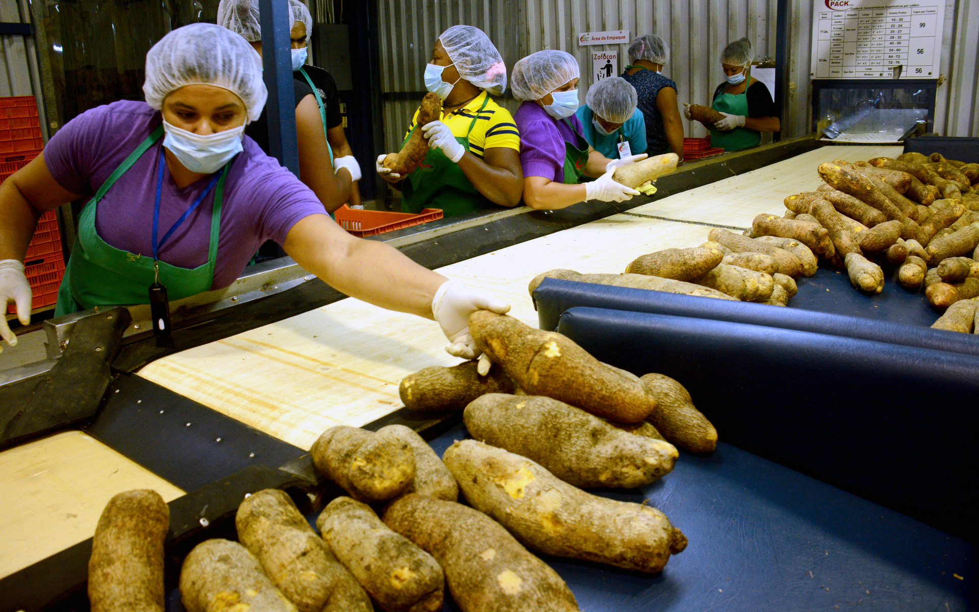 Los ñames recibidos en HortiPack para ser empacados y exportados pasan por un proceso roceso de lavado, desinfección, secado y curado. La última parte del proceso es selección y empaque, cuando los ñames se clasifica por tamaño y son colocados cuidadosamente en cajas de cartón, separando cada ñame con papel para evitar maltrato.