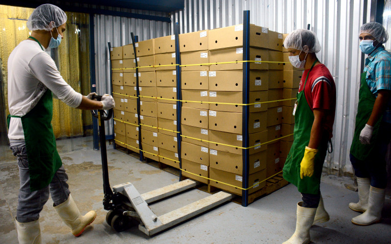 Vista del momento en que trabajadores de Horti Pack realizan labores de empaque para la exportación del primer furgón de ñame blanco que saldrá desde Samaná hacia Nueva York.