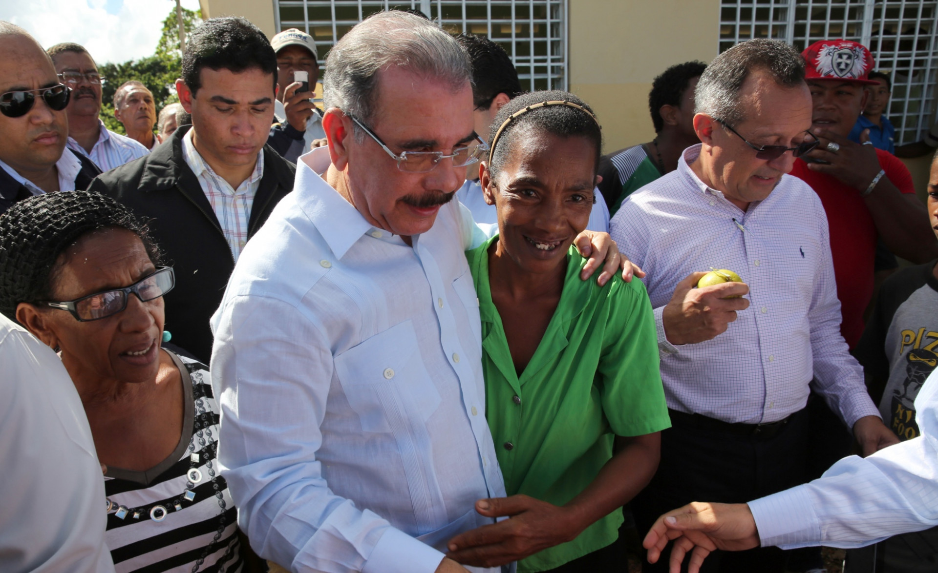 El presidente Medina y moradores de la zona presentes durante su visita sorpresa al distrito municipal Barraquito, en Villa Riva, provincia Duarte.