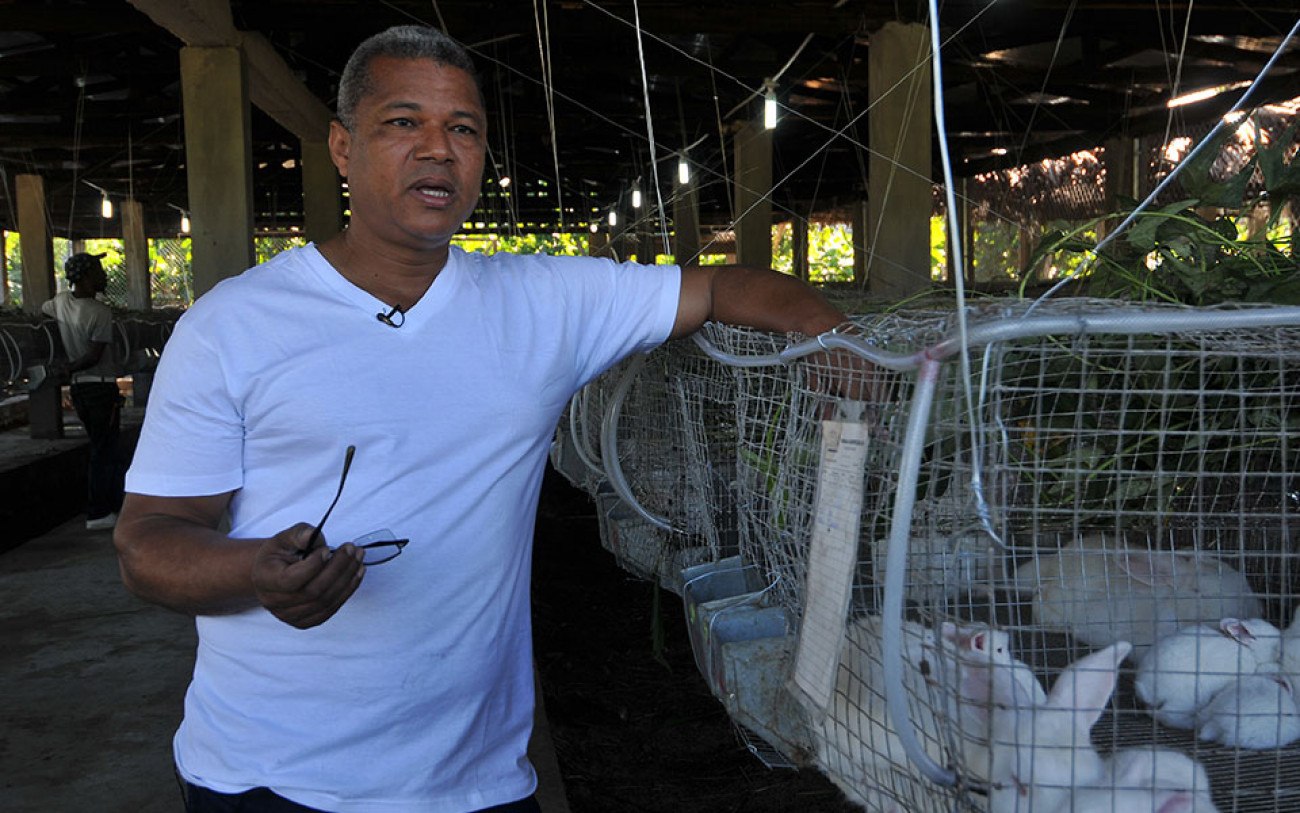 Wellington Sierra, al explicar que una coneja de buena raza produce 4 veces más carne que una vaca. Puede llegar a tener entre 5 y 6 partos al año. Para producir 1 libra de carne de conejo sólo se requieren 3 libras de alimento.