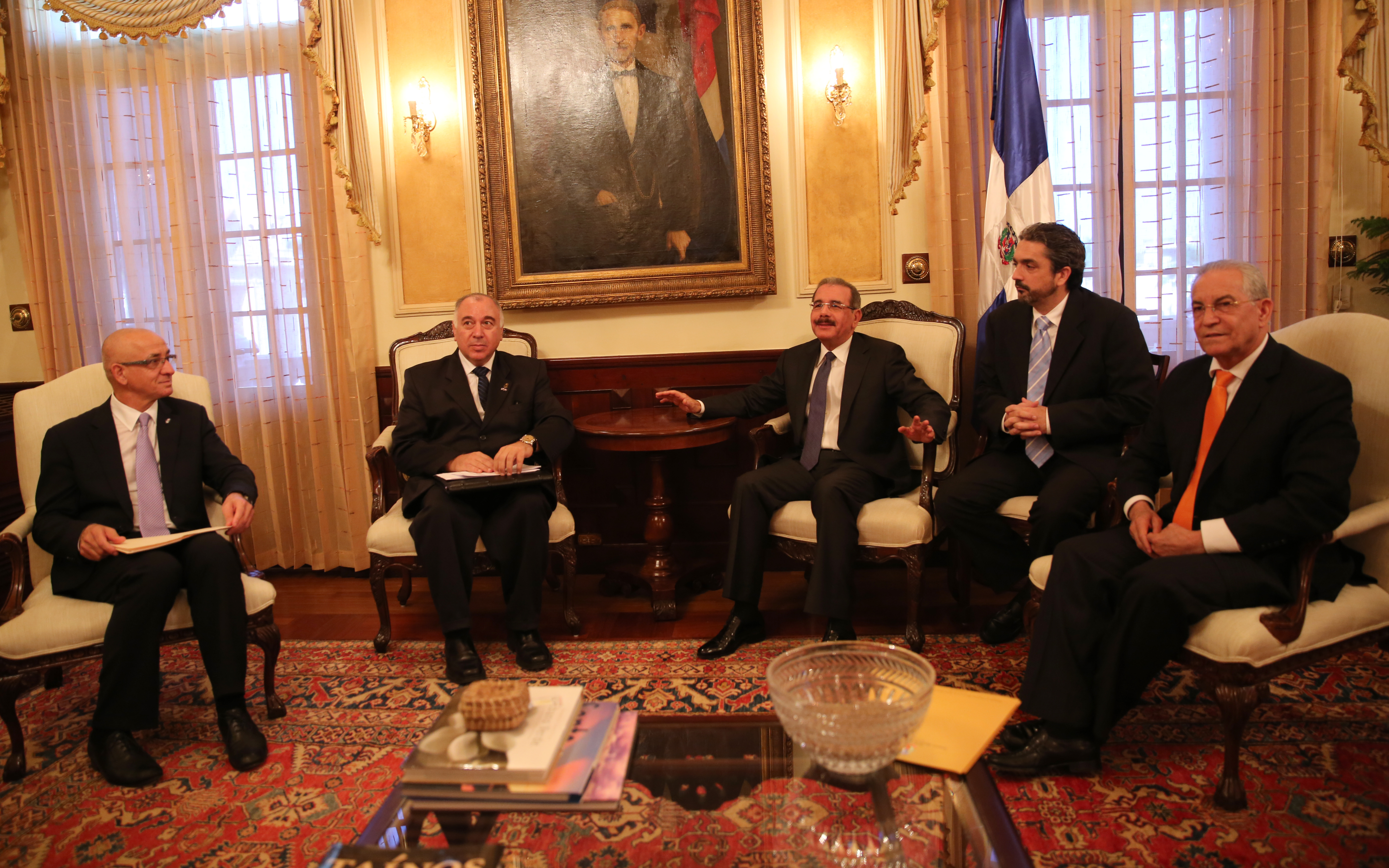 El presidente Danilo Medina acompañado del embajador de Israel en el País, Bahij Mansour; Haim Taib, presidente del Grupo Mitrelli; Antonio Vargas, ordenador nacional de los Fondos Europeos para el Desarrollo e integrantes del grupo de inversionistas, presentes durante el encuentro en el despacho Presidencial.