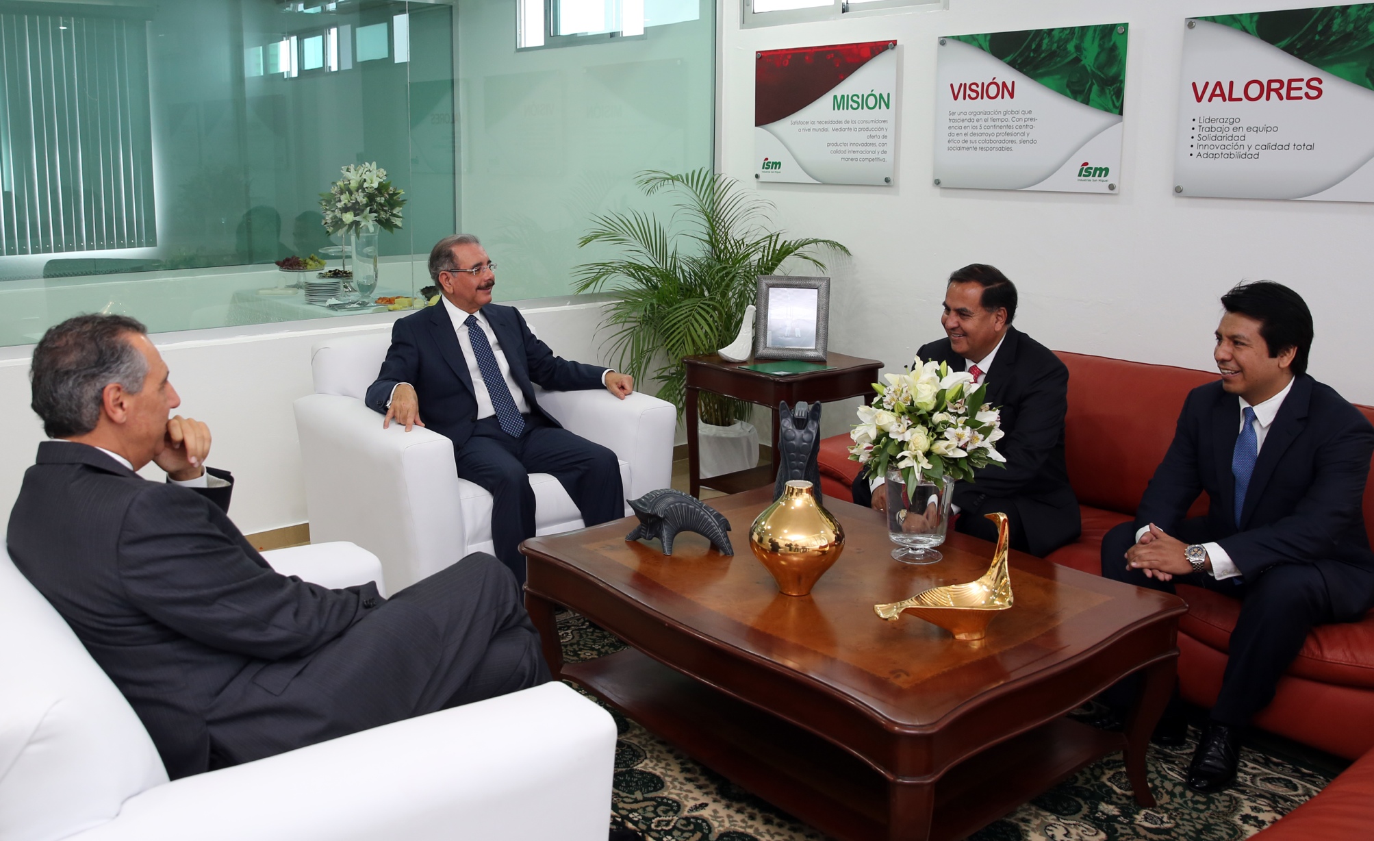 Presidente de la República, Danilo Medina, junto a Arturo Marroquín Alcázar; Jorge Añaños y.José Ramón Peralta, durante encuentro previo a la recepción.