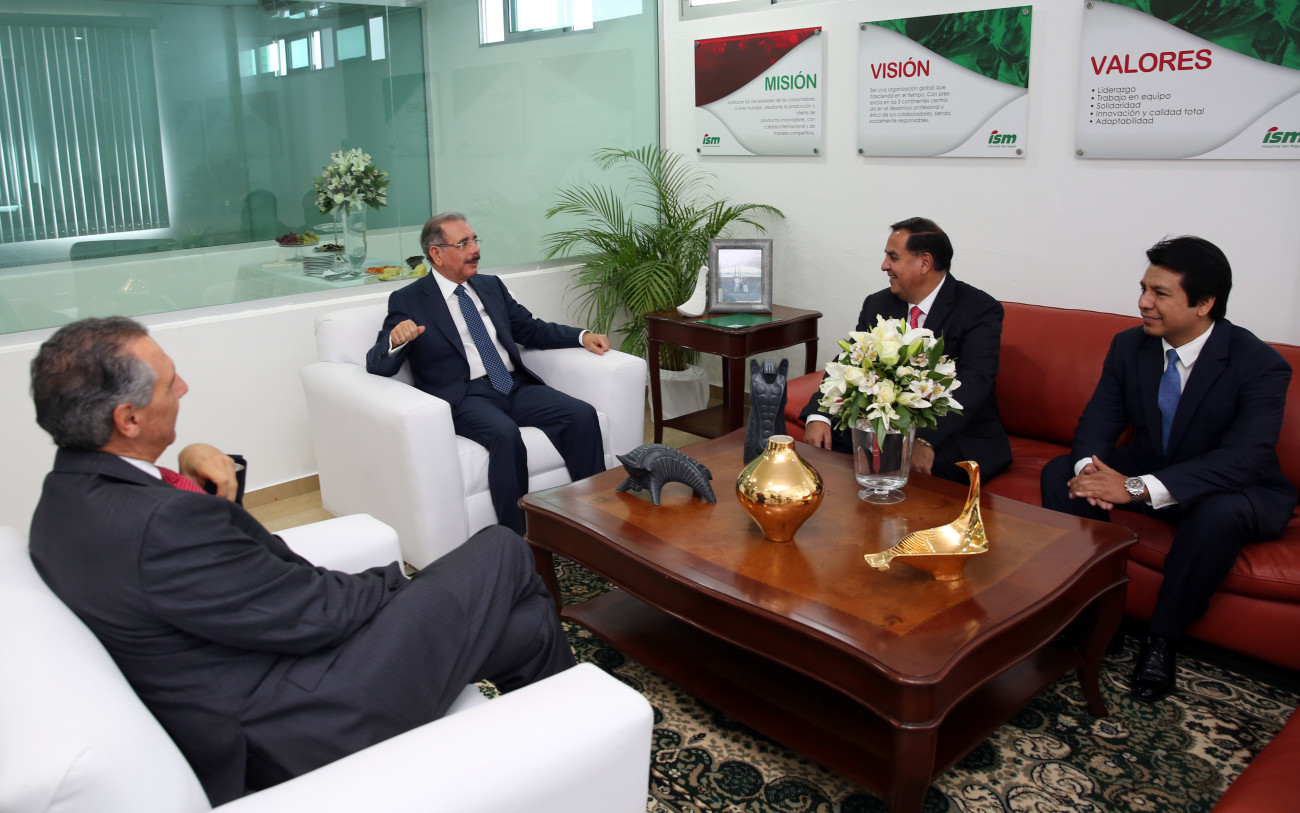 El presidente Danilo Medina junto a Arturo Marroquín Alcázar, gerente general de Industrias San Miguel; Jorge Añaños gerente y fundador de la industria y José Ramón Peralta, ministro administrativo de la Presidencia, mientras conversan previo al acto de inauguracion de las nuevas instalaciones.