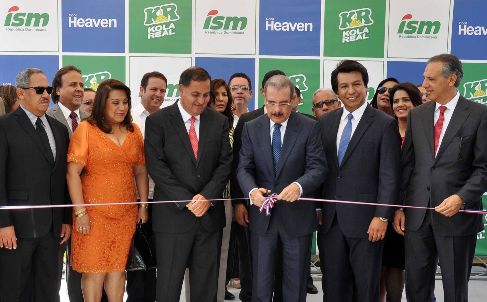 El presidente de la República, Danilo Medina y Arturo Marroquín, gerente general de Industrias San Miguel del Caribe, al momento de encabezar el tradicional corte de cinta para dejar inaugurada la ampliación de la planta de producción de la industria. Le acompañan el presidente de la empresa, Jorge Añaños; la vicepresidenta de la empresa,Tania Alcázar de Añaños; el gobernador de la provincia,Miguel Ángel Núñez Rodríguez; el ministro administrativo de la Presidencia, José Ramón Peralta; el embajador de Perú en el país, Enrique Palacios; la cónsul comercial de la Embajada de Estados Unidos, Isabella Cascarano, entre otras personalidades.