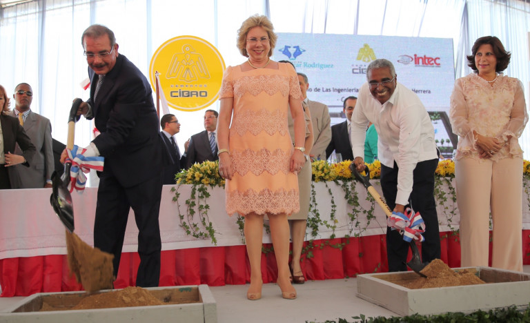 El presidente Danilo Medina y Rolando Guzmán, rector de Intec, mientras dan el primer palazo durante la recepción inaugural para dejar iniciados los trabajos de construcción de la nueva obra. Figuran además, Laura Acra, presidenta de la Junta de Regentes; y Denisse Rodríguez de Fernández, presidenta de Cementos Cibao.