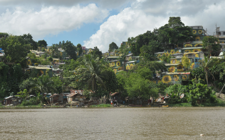 Vista actual del sector La Barquita, ubicada a orillas del río Ozama en Santo Domingo Este, visitada ayer por miembros de la comisión del Banco Mundial en unidades de salvamento y rescate de la Marina de Guerra para conocer de cerca el proyecto de re-adecuación que lleva a cabo el gobierno. Foto: Félix Lara/Presidencia República Dominicana.