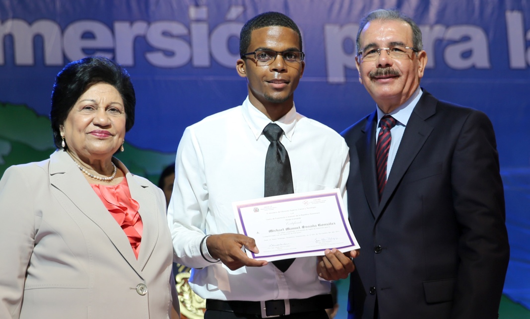 El presidente Medina hace entrega del reconocimiento a uno de los jóvenes graduados del Programa Inglés de Inmersión para la competitividad, donde 26 de ellos fueron reconocidos durante la actividad por su destacada participación.