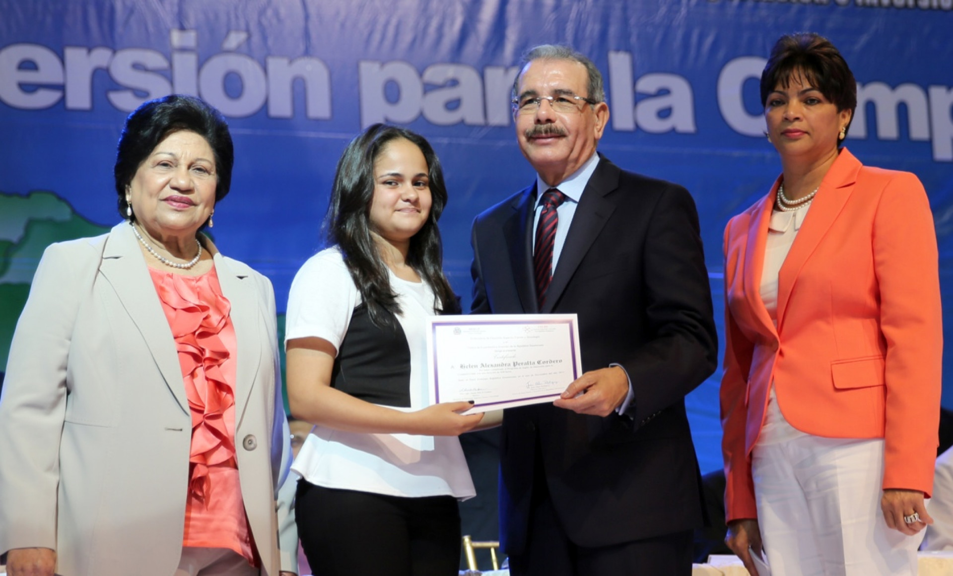 El presidente Medina hace entrega del reconocimiento a una de las jóvenes graduadas del Programa Inglés de Inmersión para la competitividad, donde 26 de ellos fueron reconocidos durante la actividad por su destacada participación.