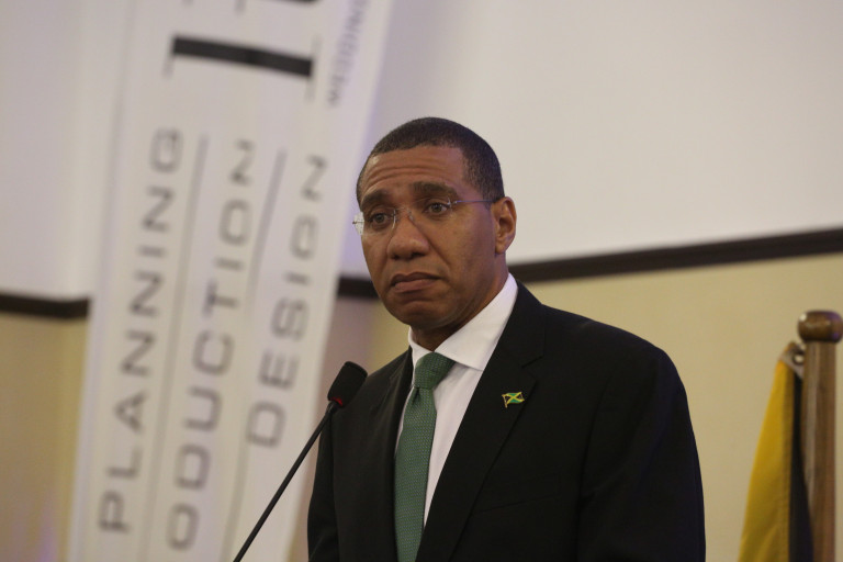 Primer ministro de Jamaica, Andrew Holness, se dirige a los presentes durante el almuerzo ofrecido en el marco de la Conferencia Internacional del Turismo, celebrada en Montego Bay, Jamaica.