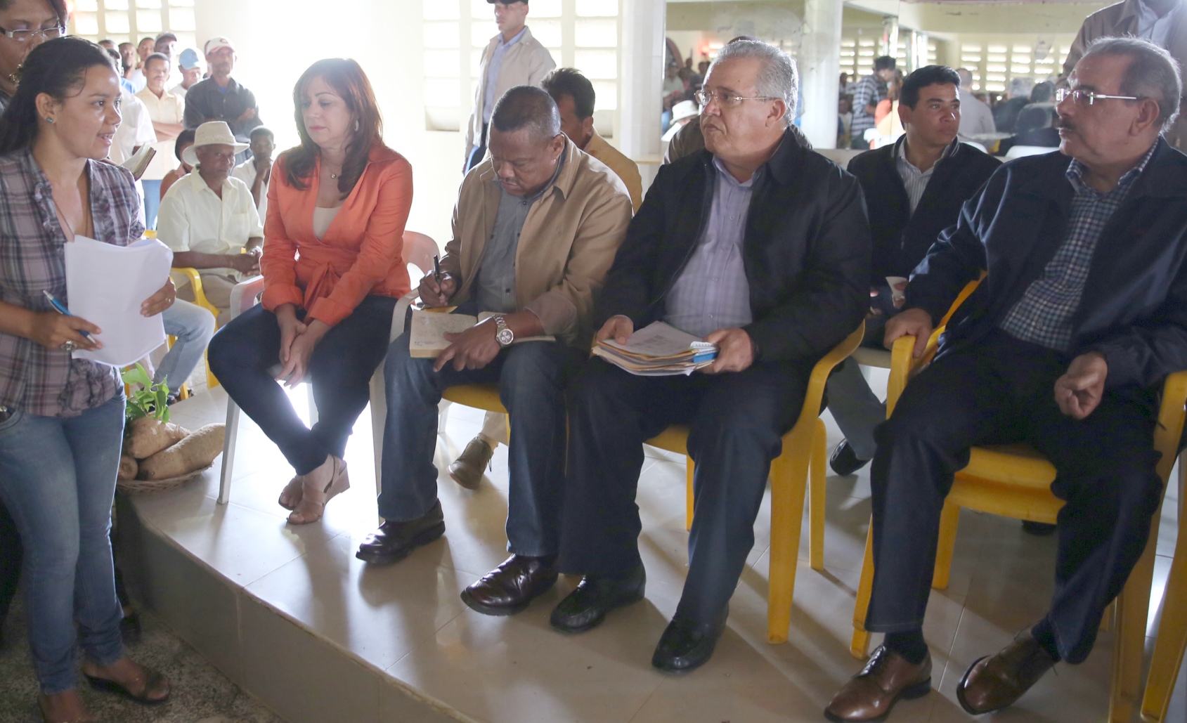 Yaminé Zorrilla, de la Asociación de Mujeres Porcicultoras de Peña Blanca, en Pedro Sánchez, mientras expone proyecto de mujeres de la esa comunidad.al presidente Medina y comitiva presente en el encuentro.