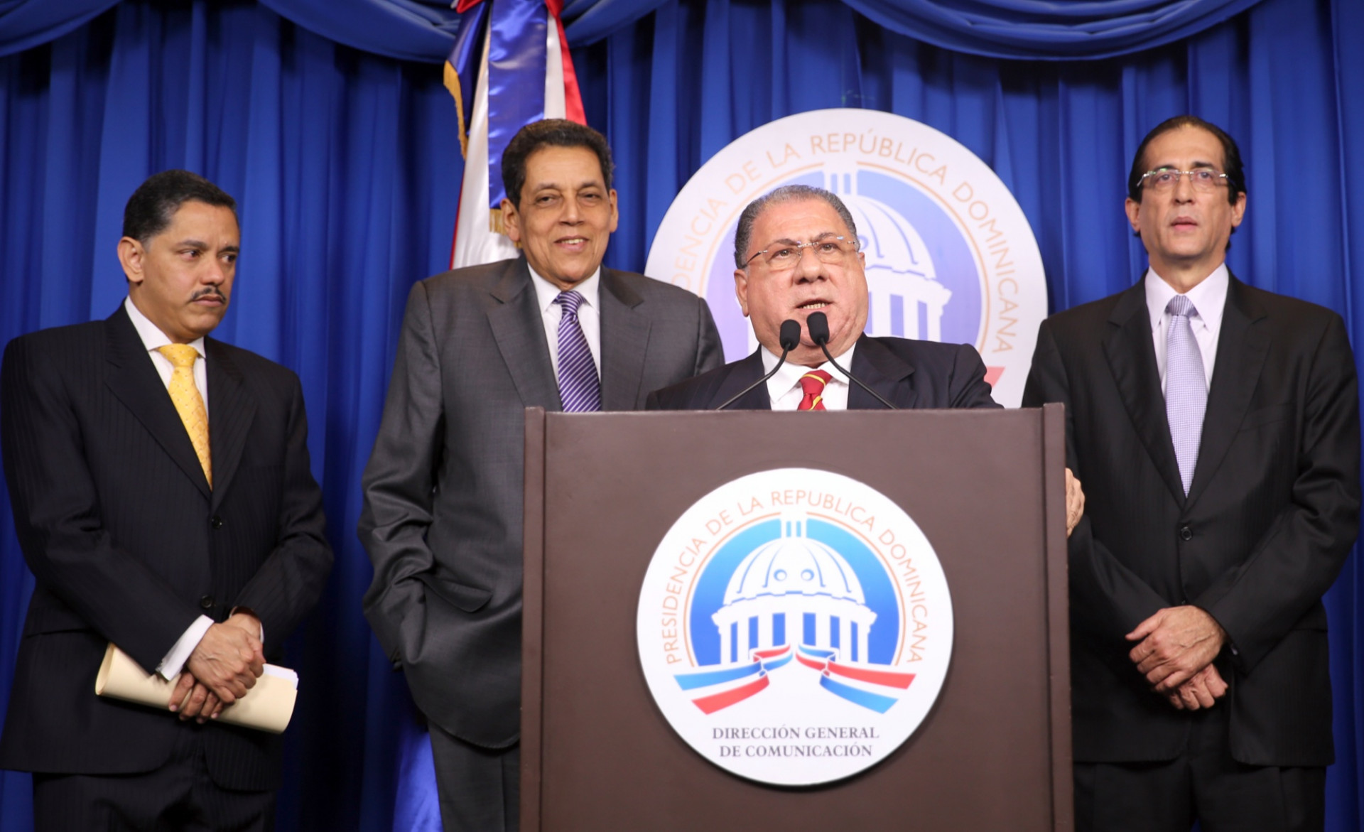 El ministro de Interior y Policía, José Ramón Fadul, durante anuncio hecho luego de una reunión con el presidente Danilo Medina. Figuran además, el ministro de la Presidencia, Gustavo Montalvo; el consultor Jurídico del Poder Ejecutivo, César Pina Toribio y el director general de Migración, José Ricardo Taveras, presentes durante las declaraciones ofrecidas hoy por la comisión, en el Salón Orlando Martínez del Palacio Nacional.