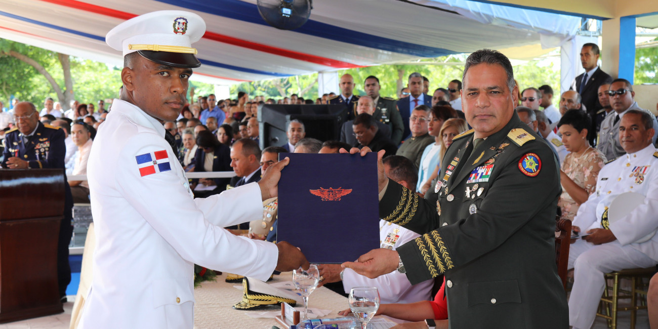 Ministro de Defensa, teniente general Rubén D. Paulino Sem, junto a uno de los graduandos.
