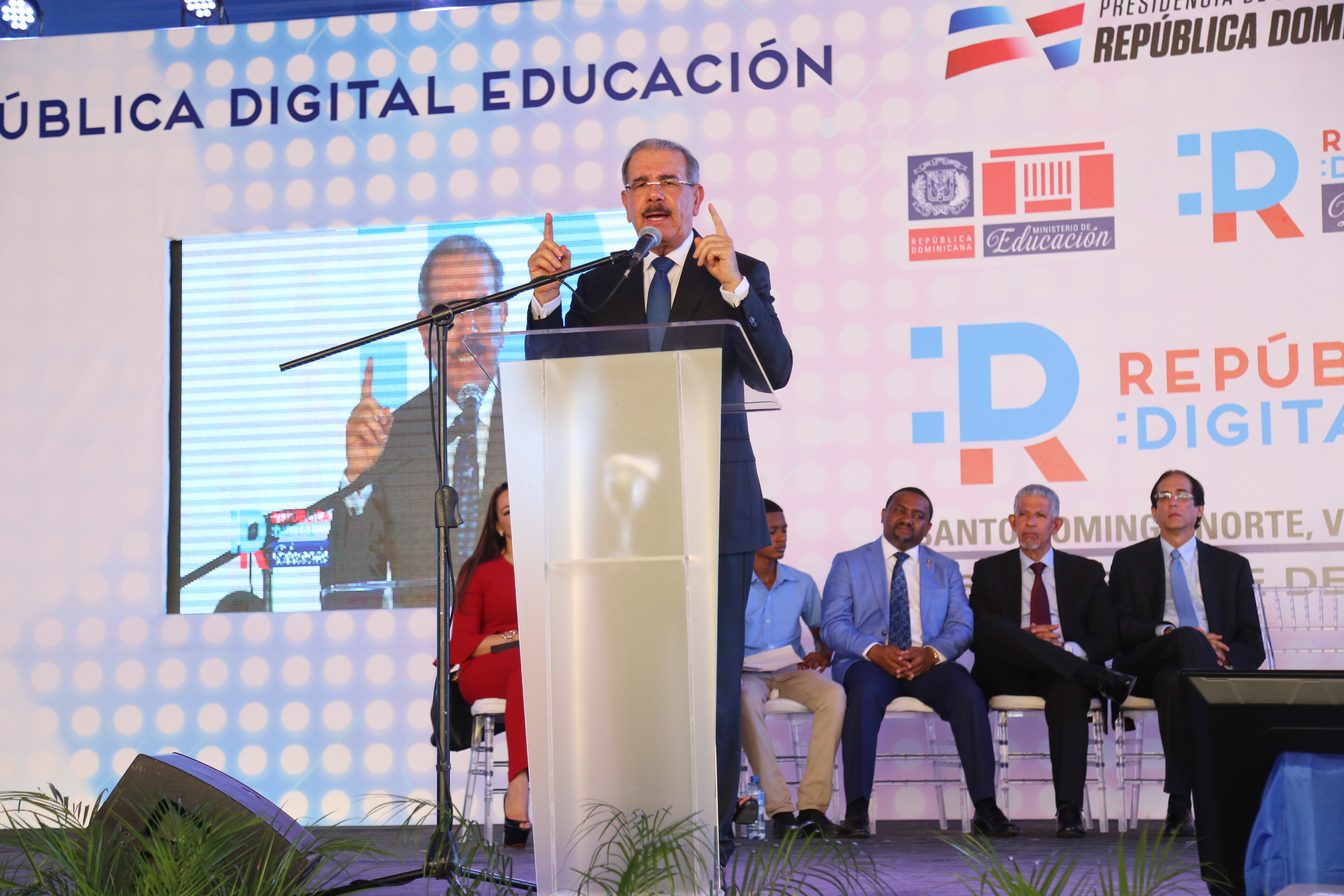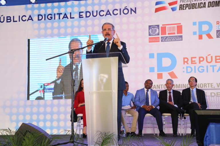 El presidente Danilo Medina durante su discurso en el acto de lanzamiento del programa República Digital Educación, celebrado hoy en el Politécnico Francisco Alberto Caamaño Deñó, en Los Coralitos, Santo Domingo Norte. #RepúblicaDigital Educación
