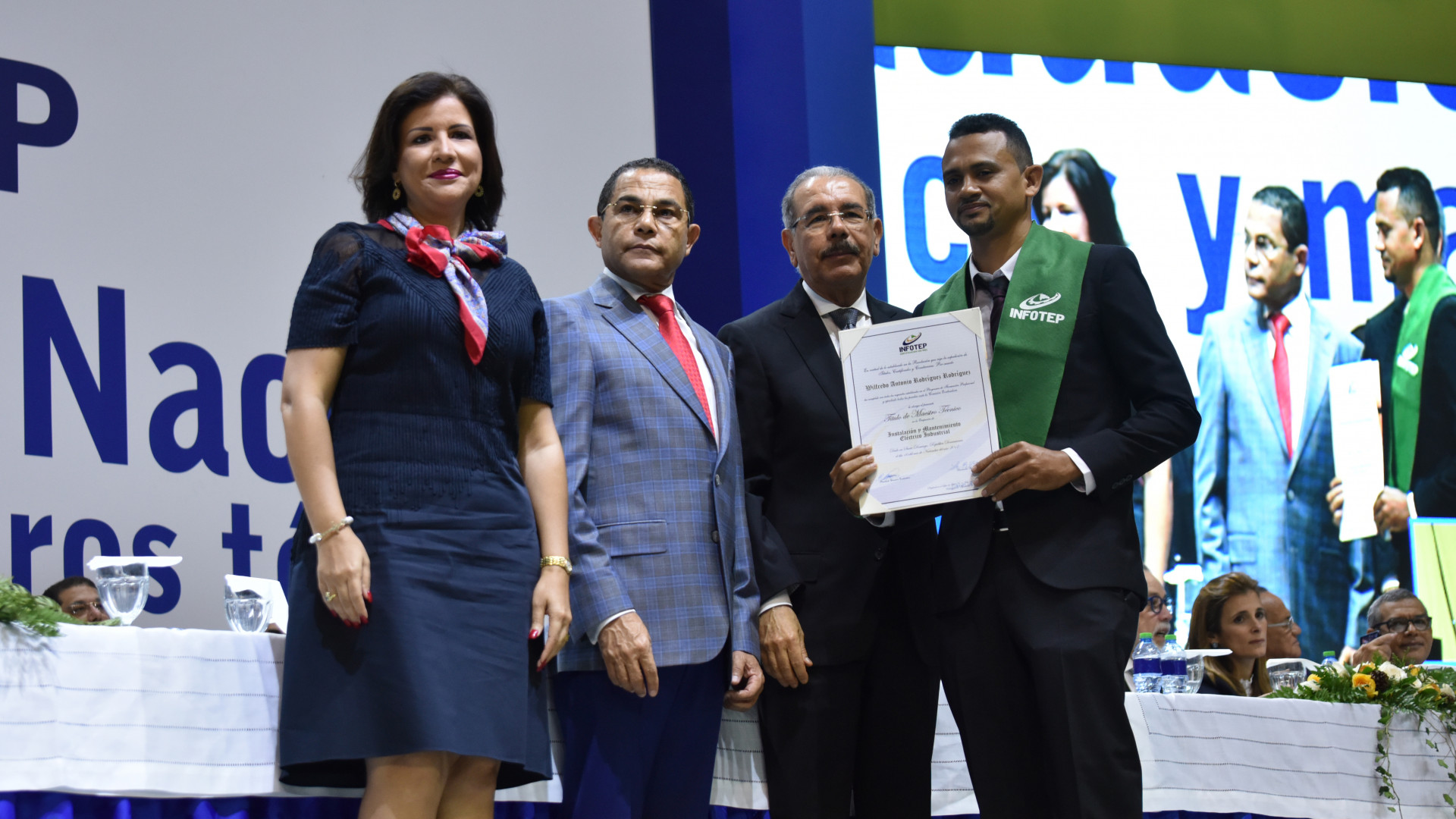 El presidente Danilo Medina, la vicepresidenta Margarita Cedeño de Fernández; y el director general del INFOTEP, Rafael Ovalles; entregan certificado a uno de los graduandos.