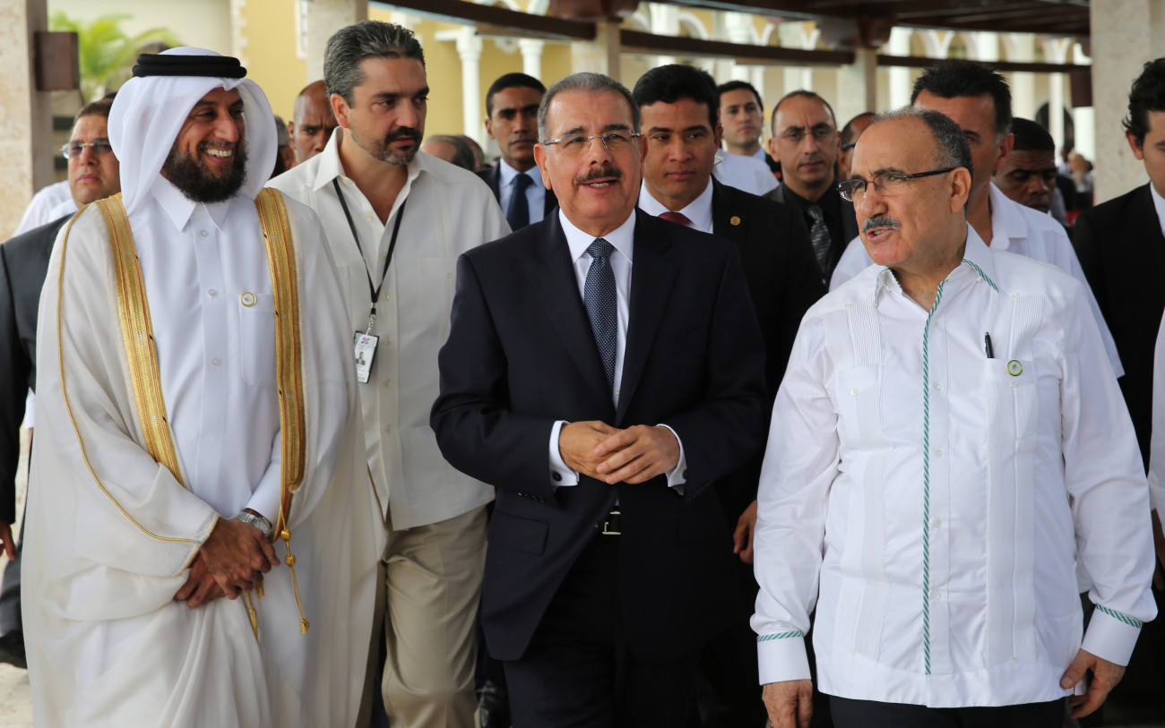 El presidente Danilo Medina junto a Ahmed Bin Mouhamad Al-Marikhy, del Fondo de Desarrollo de Qatar, y Beşir Atalay, vice primer ministro de Turquía.