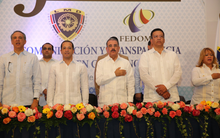 Participación del presidente Danilo Medina al encabeza el acto de apertura del Tercer Congreso de Autoridades Locales junto al ministro Administrativo de la Presidencia, José Ramón Peralta (izquierda), Juan de los Santos, alcalde de Santo Domingo Este y presidente de a Federación Dominicana de Municipios (Fedomu), John (Johnny) Jones, secretario de la Liga Municipal Dominicana, entre otros.