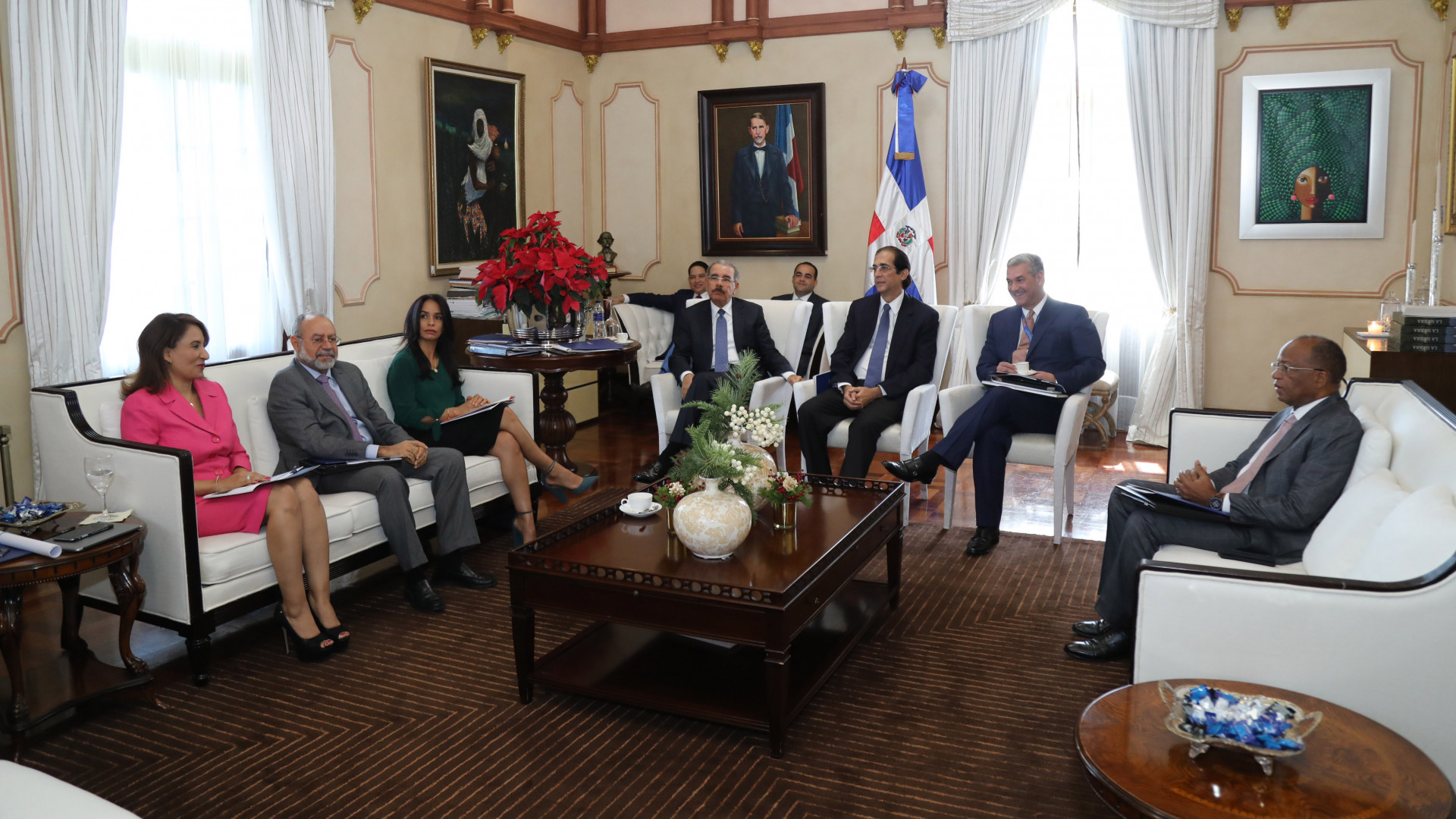 El presidente Danilo Medina y miembros de la Comisión Ejecutiva del Plan Estratégico de Movilidad Urbana Sostenible para la ciudad de Santo Domingo, durante reunión efectuada hoy en su despacho del Palacio Nacional.