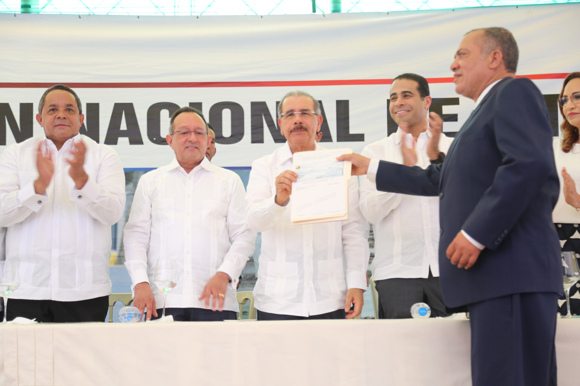 El presidente Danilo Medina hizo entrega de 1,504 títulos definitivos de propiedad de parcelas y solares de viviendas, a parceleros de las comunidades Áciba y Villa Bao, de Santiago, durante acto celebrado hoy en Hato del Yaque.