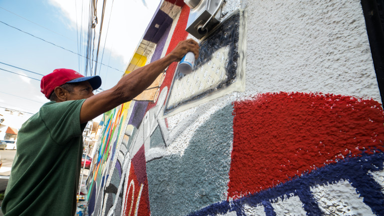 Manuel Omar Hernández es muralista en su barrio Los Pepines, Santiago. Sus murales recogen preocupaciones culturales y de preservación medio ambiental; una forma de comunicar para cambiar actitudes y comportamientos de su gente en el barrio y más allá. #SomosDeBarrio Foto: Presidencia República Dominicana Enlace noticia: presidencia.gob.do/noticias/los-pepines-santiago-manuel-o... Video YouTube: www.youtube.com/watch?v=7RwViM3Mu4E
