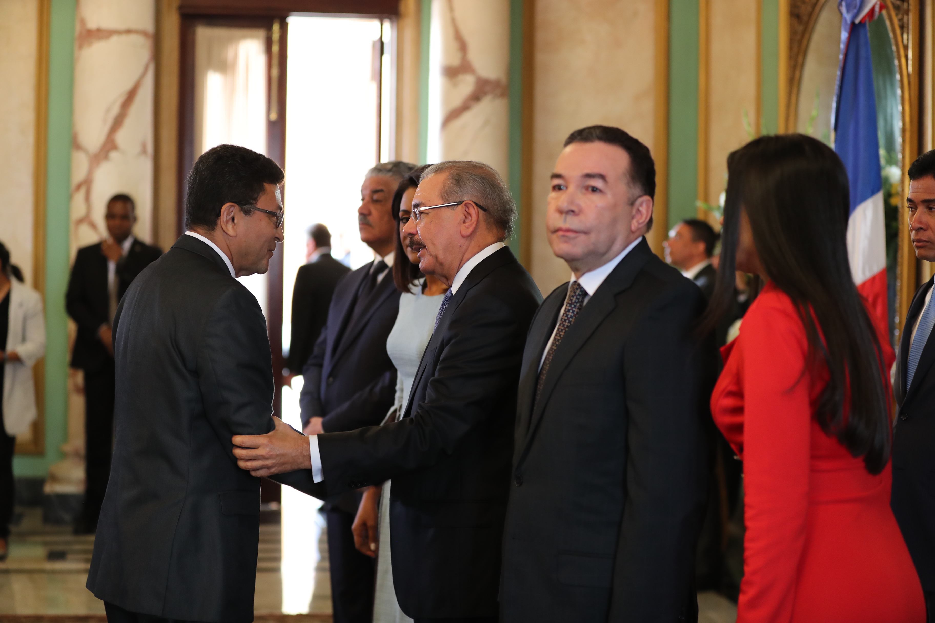 El presidente Danilo Medina y su esposa Cándida Montilla de Medina recibieron los tradicionales saludos de Año Nuevo, de parte del cuerpo diplomático y consular acreditado en el país, funcionarios de su gabinete; altos mandos militares y representantes de la iglesia, presentes en el Salón de Embajadores del Palacio Nacional.