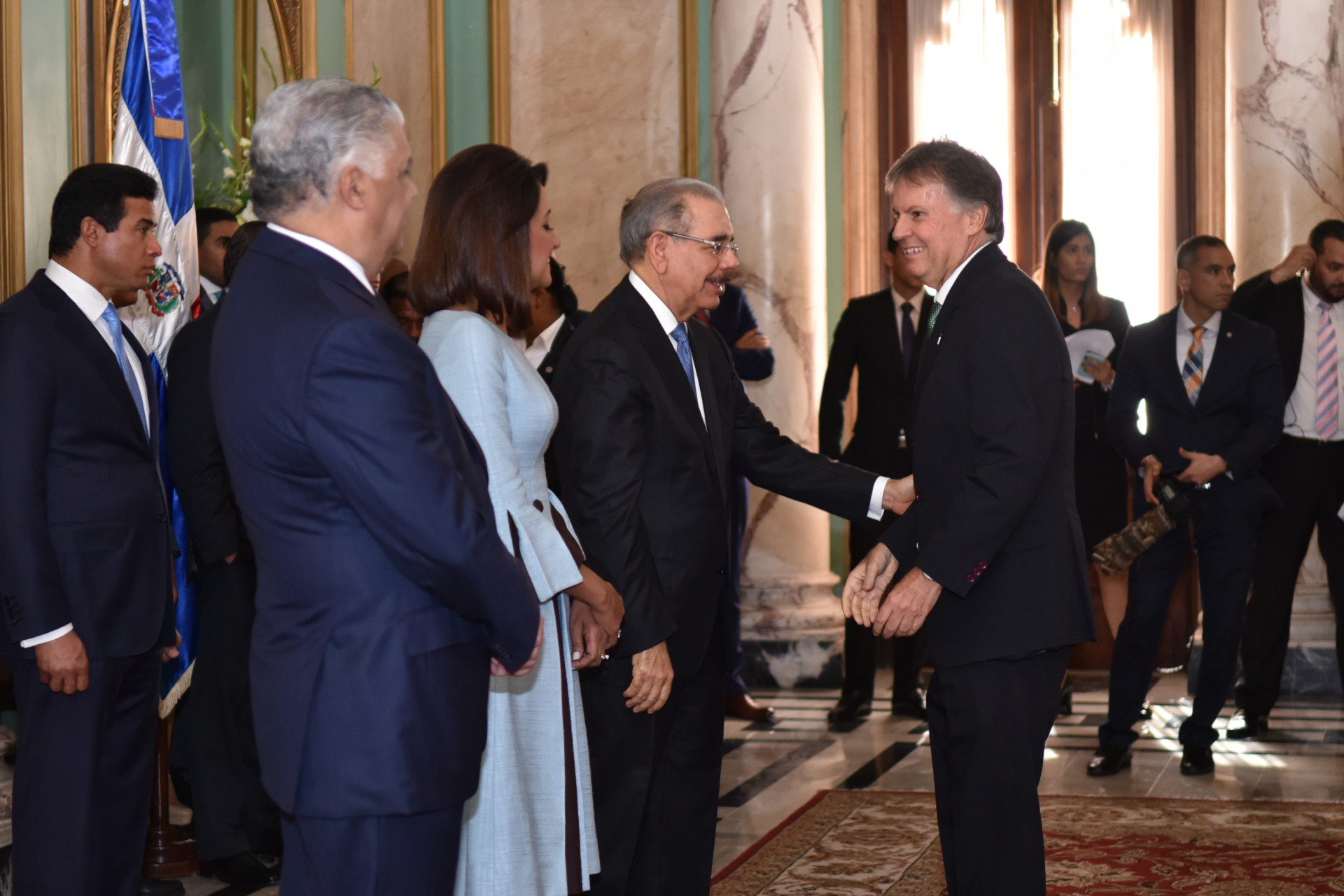 El presidente Danilo Medina y su esposa Cándida Montilla de Medina recibieron los tradicionales saludos de Año Nuevo, de parte del cuerpo diplomático y consular acreditado en el país, funcionarios de su gabinete; altos mandos militares y representantes de la iglesia, presentes en el Salón de Embajadores del Palacio Nacional.