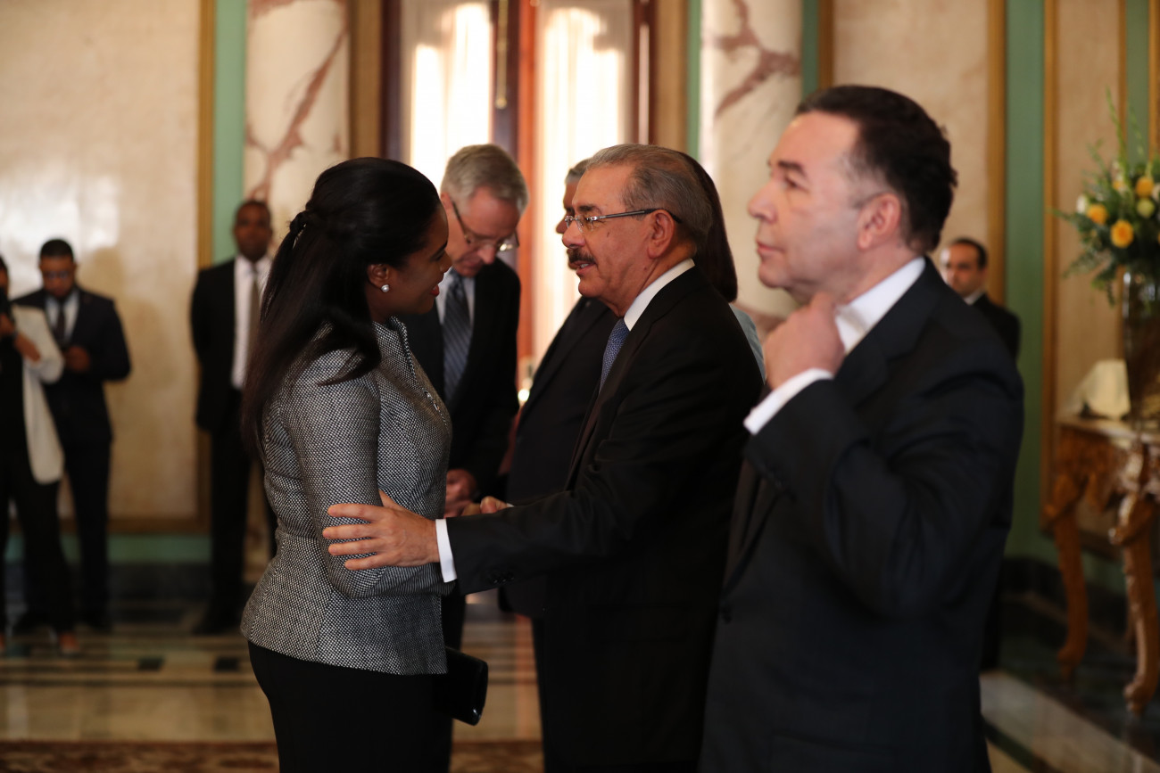 El presidente Danilo Medina y su esposa Cándida Montilla de Medina recibieron los tradicionales saludos de Año Nuevo, de parte del cuerpo diplomático y consular acreditado en el país, funcionarios de su gabinete; altos mandos militares y representantes de la iglesia, presentes en el Salón de Embajadores del Palacio Nacional.