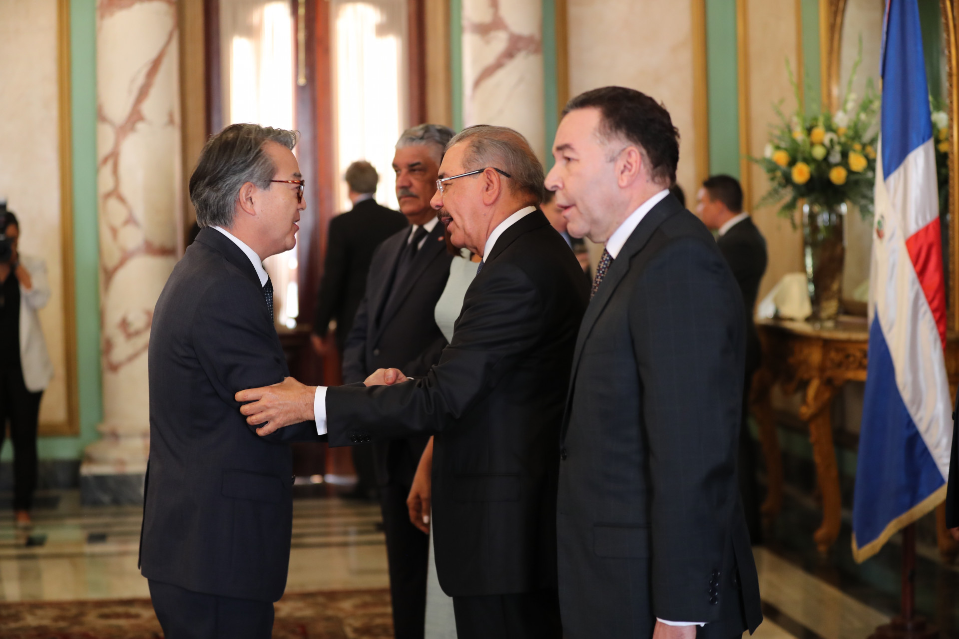 El presidente Danilo Medina y su esposa Cándida Montilla de Medina recibieron los tradicionales saludos de Año Nuevo, de parte del cuerpo diplomático y consular acreditado en el país, funcionarios de su gabinete; altos mandos militares y representantes de la iglesia, presentes en el Salón de Embajadores del Palacio Nacional.