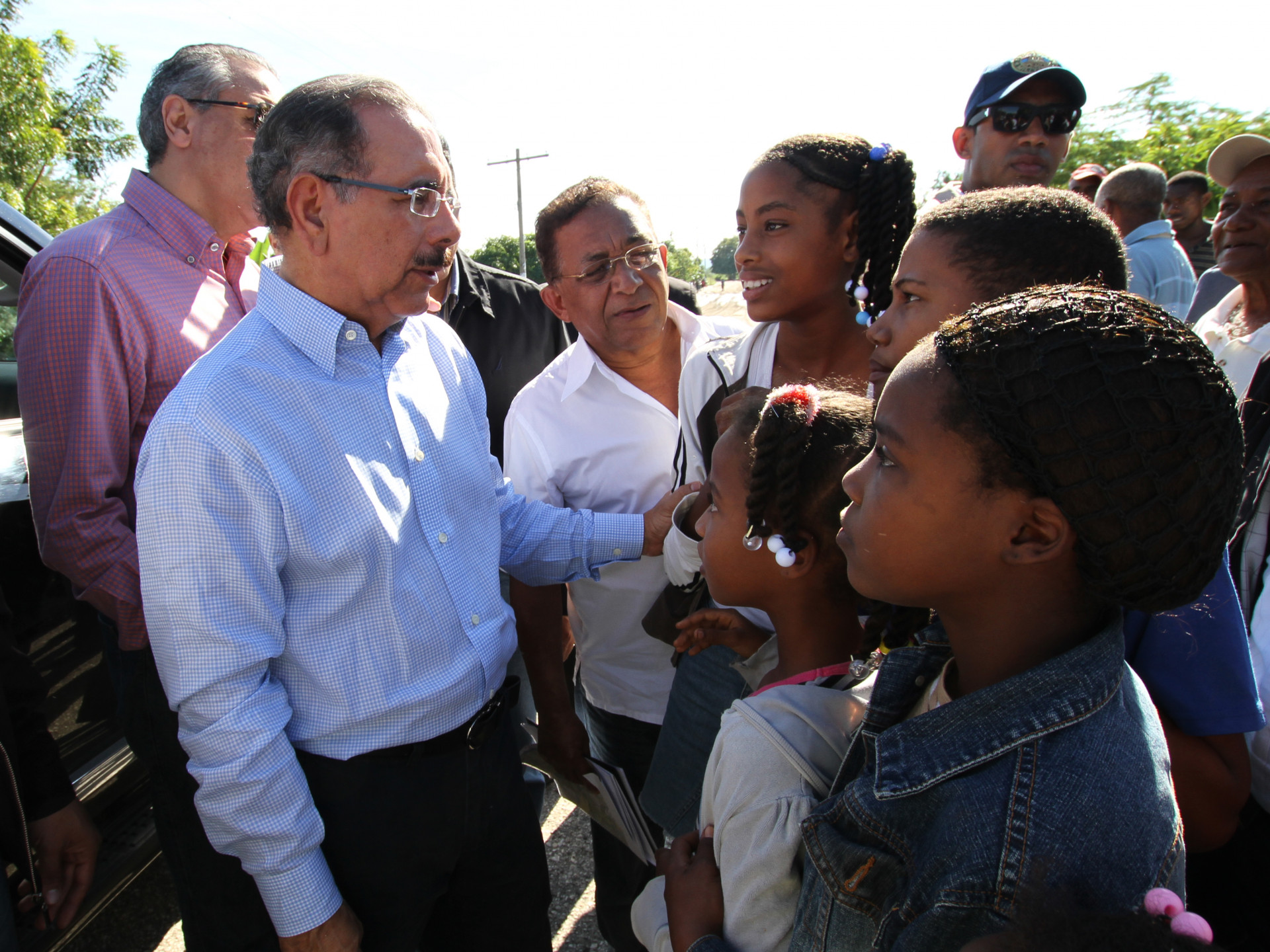 Un grupo de niños de Sabana Grande, San Juan le piden al presidente Medina que les repare su escuela. De inmediato el Mandatario se desplazó hasta el plantel, y al comprobar que requería de mantenimiento ordenó iniciar las labores de restauración. Esta foto fue tomada en la comunidad de Sabana Grande el domingo 2 de diciembre de 2012.
