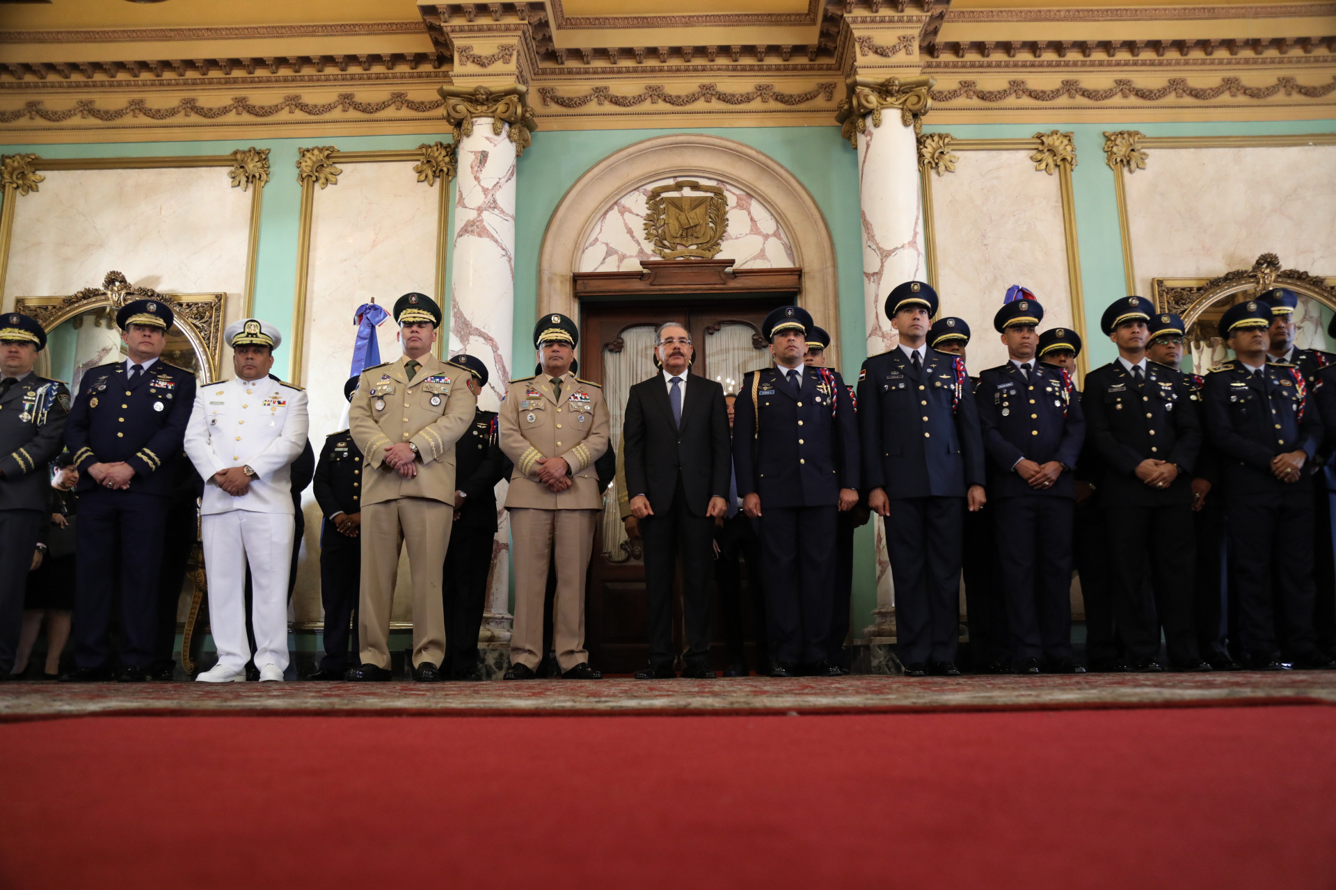 El presidente Danilo Medina recibió, como es ya una tradición, los saludos de los oficiales de las Fuerzas Armadas y la Policía Nacional con 35, 30, 25 y 20 años de labor interrumpida al servicio de la patria.