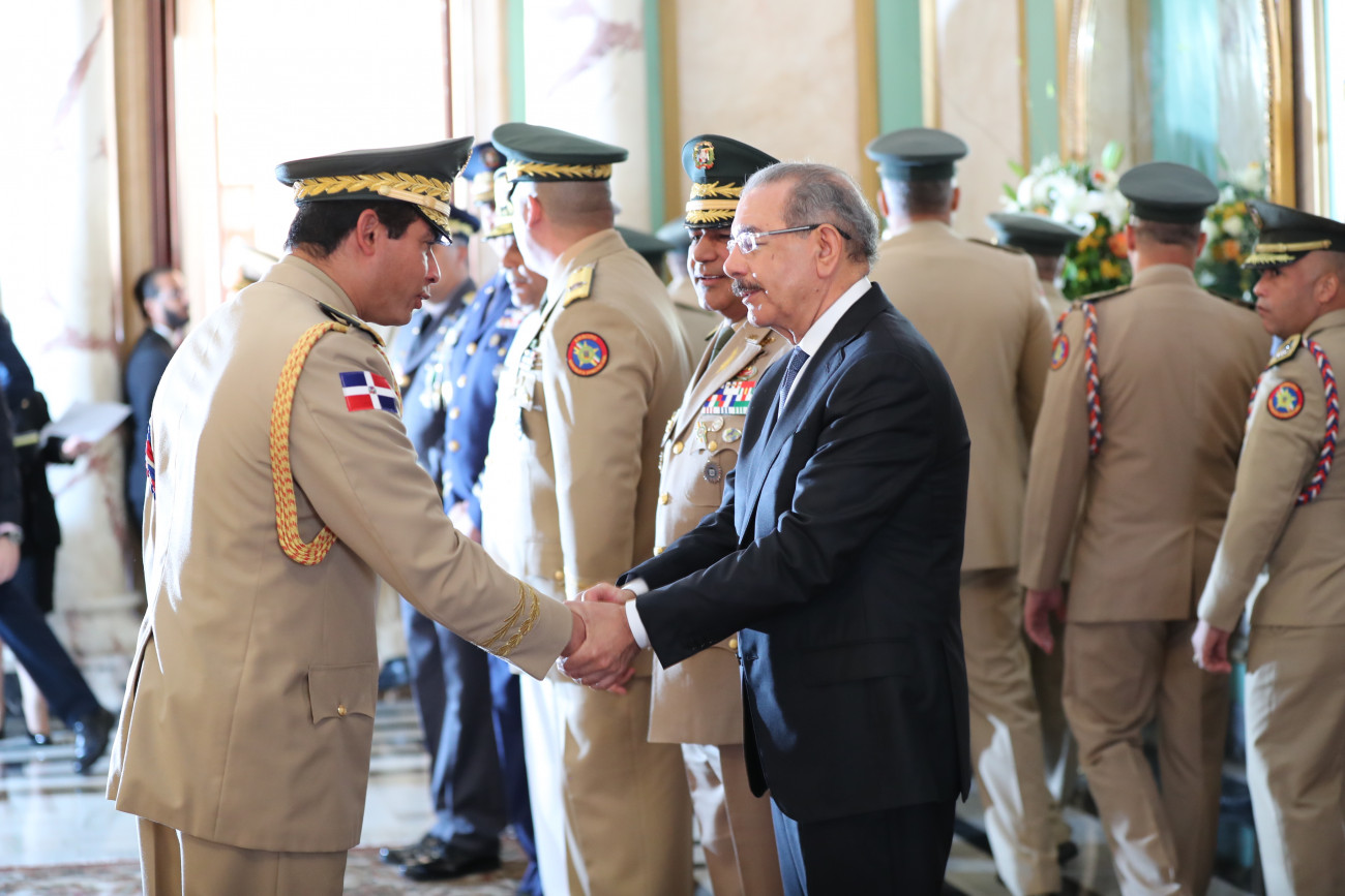 El presidente Danilo Medina recibió, como es ya una tradición, los saludos de los oficiales de las Fuerzas Armadas y la Policía Nacional con 35, 30, 25 y 20 años de labor interrumpida al servicio de la patria.