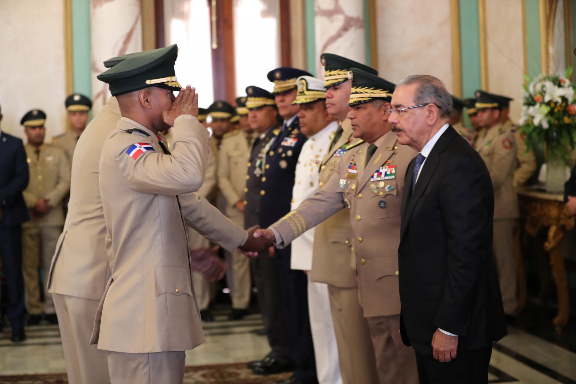 El presidente Danilo Medina recibió, como es ya una tradición, los saludos de los oficiales de las Fuerzas Armadas y la Policía Nacional con 35, 30, 25 y 20 años de labor interrumpida al servicio de la patria. Foto: Luis Ruiz Tito/ Presidencia República Dominicana Enlace notcia: presidencia.gob.do/noticias/presidente-recibe-saludos-de-... Video YouTube: www.youtube.com/watch?v=VPitQF1_LLU