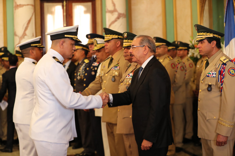 El presidente Danilo Medina se hizo acompañar de los altos mandos militares y de la Policía Nacional, entre ellos el ministro de Defensa, Rubén Paulino Sem; los comandantes del Ejército, Braulio Alcántara López; de la Armada, Miguel Enrique Peña Acosta y de la Fuerza Aérea, Luis Napoleón Payán Díaz.