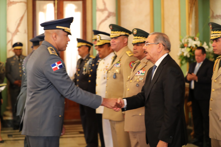 El presidente Danilo Medina recibió, como es ya una tradición, los saludos de los oficiales de las Fuerzas Armadas y la Policía Nacional con 35, 30, 25 y 20 años de labor interrumpida al servicio de la patria.