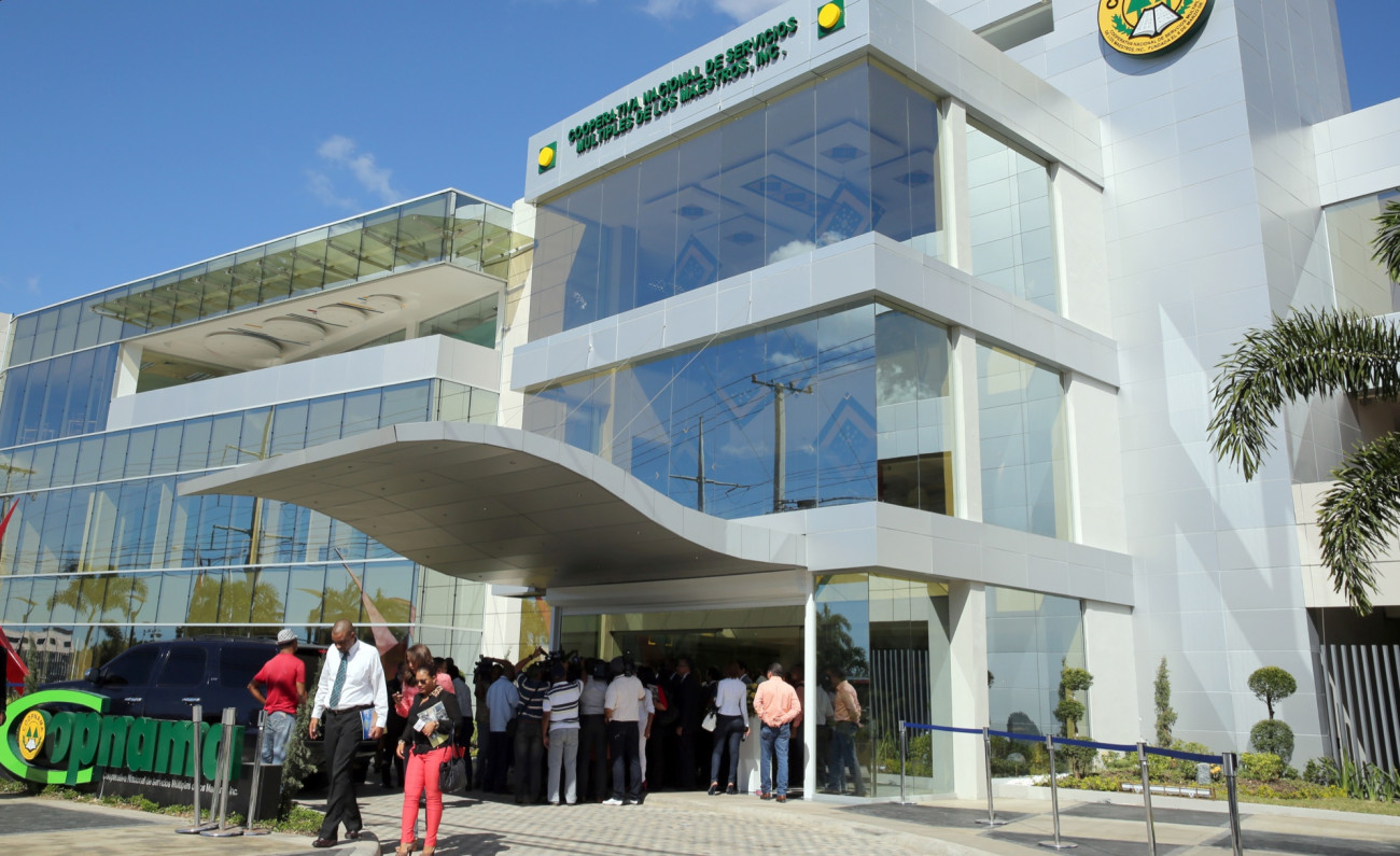 Fachada frontal del edificio que aloja la Cooperativa Nacional de Servicios Múltiples de los Maestros (COOPNAMA), ubicada en la Zona Oriental de Santo Domingo, Autopista San Isidro esquina calle Primera, del sector Savica.
