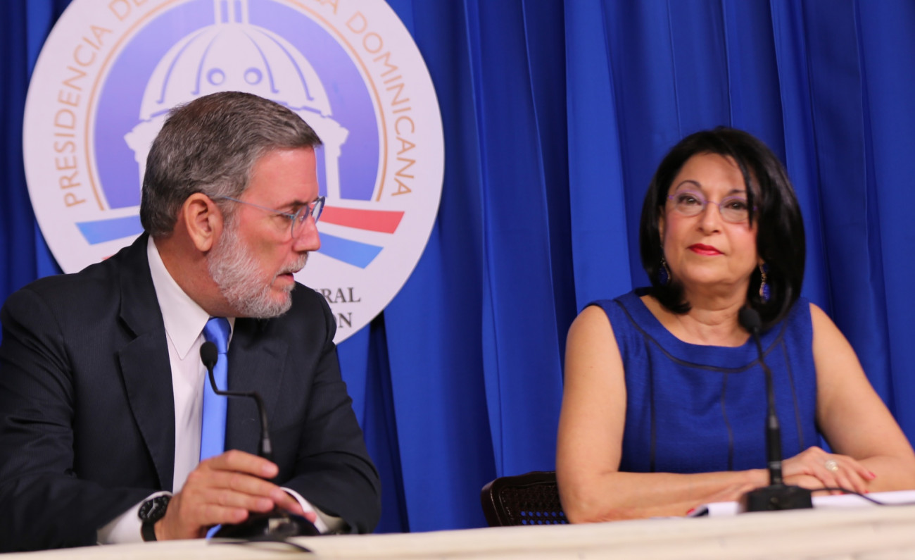 Roberto Rodríguez Marchena, director de DICOM, y Rosa Rita Álvarez, directora ejecutiva de la Fundación Reservas del País, al participar en el Encuentros con los Medios, que organiza la Dirección General de Comunicación de la Presidencia de la República